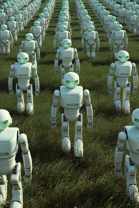 3D advertisement for Ai-brand «UJIN», a lot of robots walking on the grass field, 3D rendering, octane rendering, white and green colors