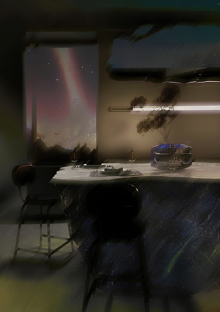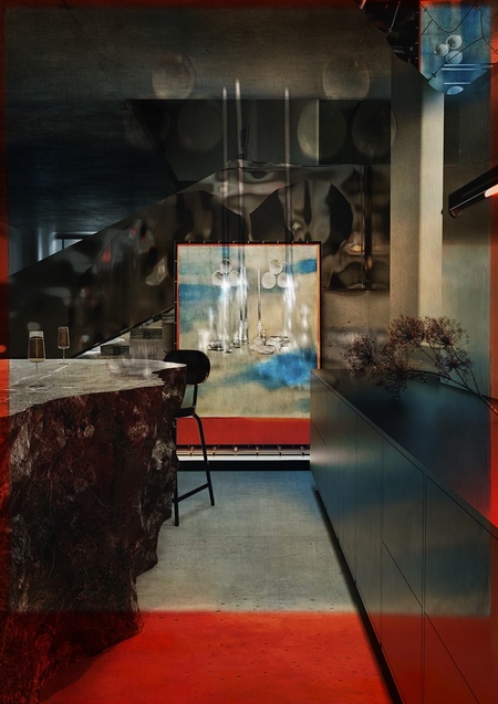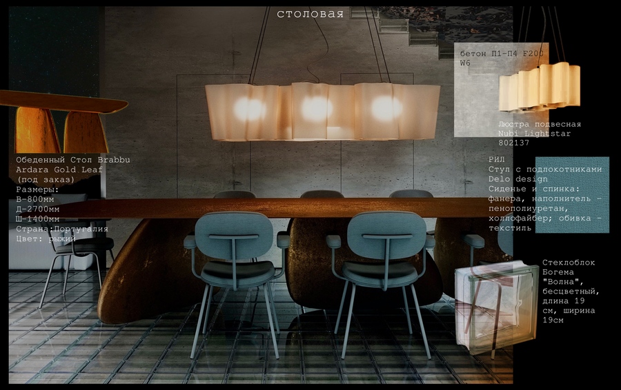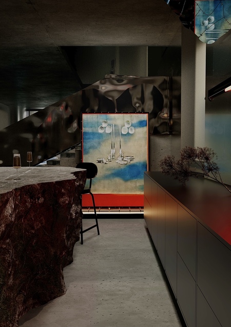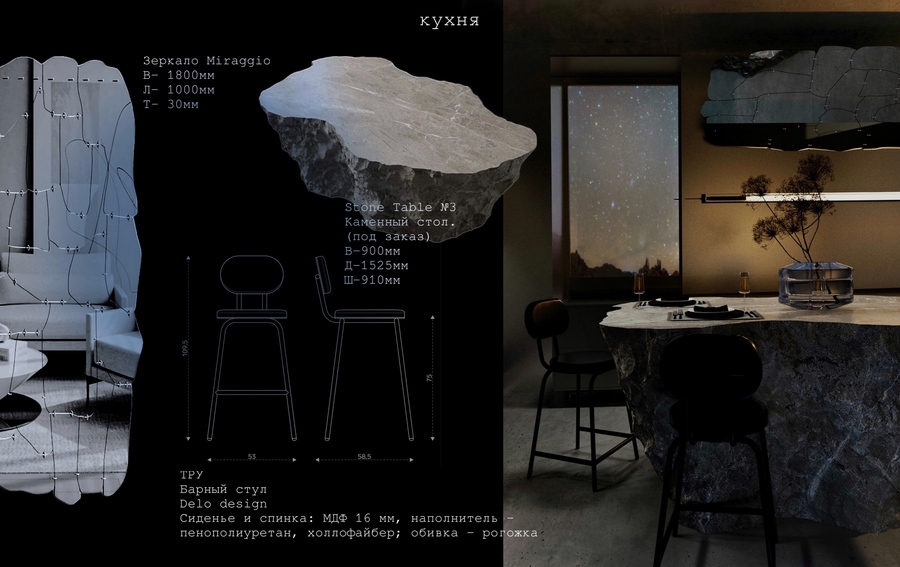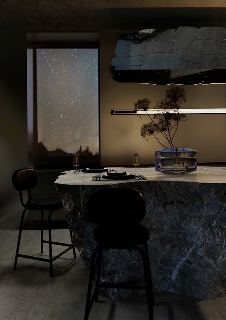 Атмосфера пространства соткана из двух противоположных начал — первозданной силы каменистой планеты и космических далей, эфемерных и загадочных. Интерьер пронизывают детали, связывающие две стихии воедино. Например, стеклоблоки как основа для сооружения подиума на первом этаже должны передать человеку ощущение парения, эмоцию удивления, причастности к небесному и лёгкому.