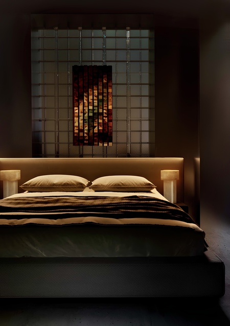 Огненно-рыжее панно над кроватью в спальне символизирует перерождение: словно формирование новой звезды или взрыв сверхновой психика и тело человека переживают стадии обновления день за днём, ночь за ночью.