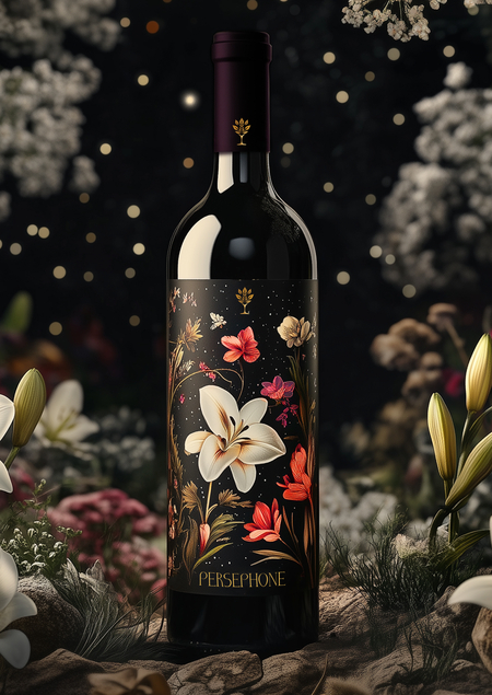 Промпт: a bottle of greek wine with white lilies and other flowers on it’s package design, the background is a blooming garden during a starry night --ar 4:3