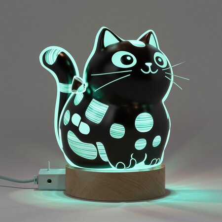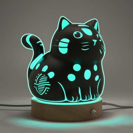 Промпт: Generate a whimsical 3D render of a nightlight lamp designed as a chubby black cat with clear white patches, reminiscent of microchip lines. Add a glowing bow tie on the back of its neck. Ensure the cat’s tail, ears, and pattern emit a calming turquoise glow. Place the lamp on a wooden base with a minimalist plug attached to its cord. The design should blend cuteness with a futuristic vibe, creating a cozy and inviting ambiance in the room.