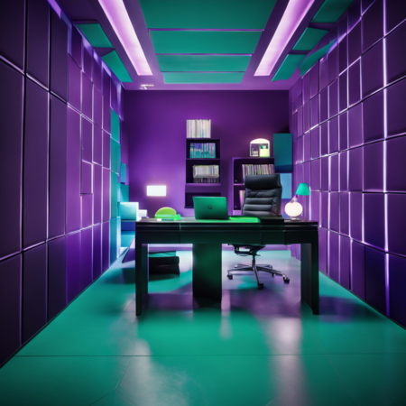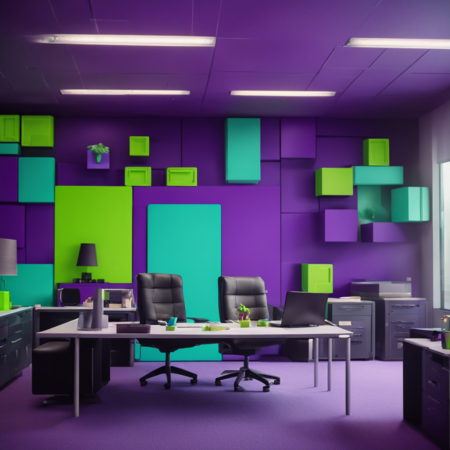 Generate an office design inspired by Tetris, incorporating geometric patterns on the blocks. Use a color palette consisting of purple, lime green, and turquoise for the blocks, furniture, and decorative elements. Ensure that the geometric patterns on the blocks are visually appealing and add depth to the overall design.
