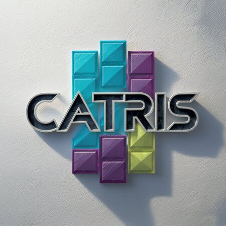Generate a logo for «CATRIS» using Tetris-style blocks in shades of turquoise, purple, and lime green. The blocks should form the letters of C A T R I S in a Press Start 2P font, resembling the style of retro video games.