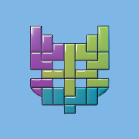 Create Tetris blocks forming the outline of a cat’s head using shades of purple, lime green, and turquoise. Arrange the blocks to depict the basic features of a cat’s face, such as ears, eyes, and nose. The resulting image should resemble the silhouette of a cat’s head while retaining the characteristic style of Tetris blocks.
