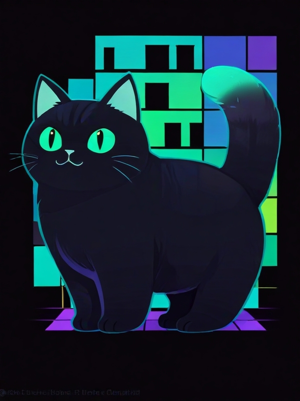 Generate an arcade hall inspired by Tetris, featuring a color palette of purple, lime green, and turquoise. In the center of the hall, place a large black cartoonish cat with glowing turquoise eyes. The cat should be chubby and adorable. Above the cat, prominently display the word «CATRIS» in bold, black letters, Press Start 2P font. Surround the cat with arcade machines, each adorned with Tetris-themed artwork and designs. A chubby black cat with microchip lines. Add a glowing bow tie on the back of its neck. Ensure the cat’s tail, ears, and pattern emit a calming turquoise glow., cinematic, photo