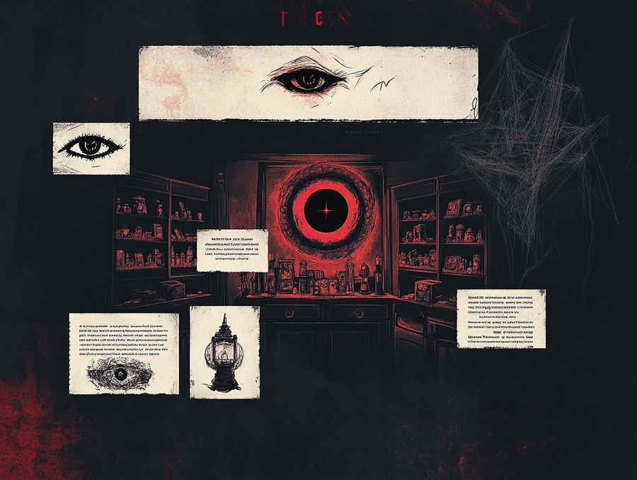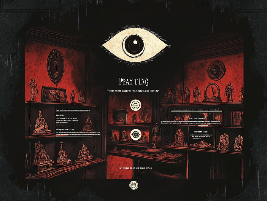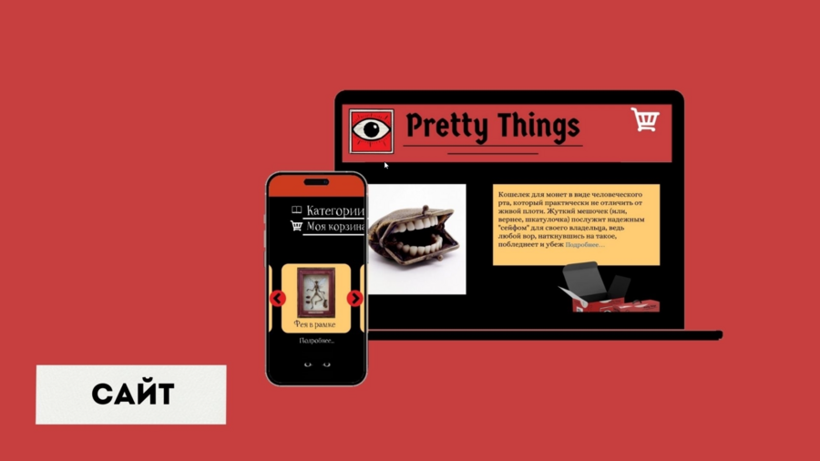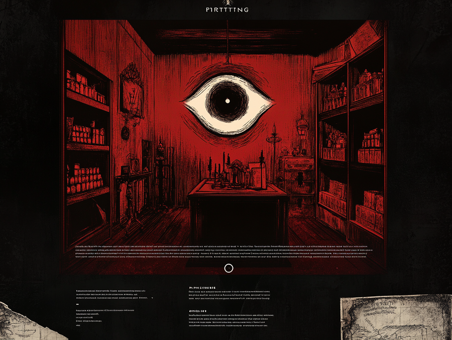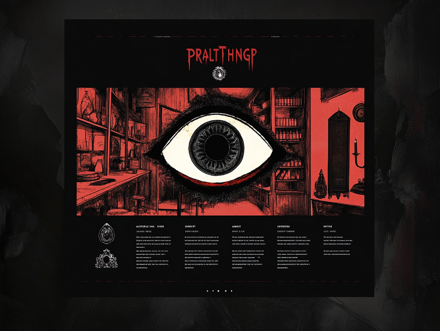 Промт: A mysterious, gothic-style website design for an antique shop called 'Pretty Things, ' specializing in mystical artifacts. The site should have a dark, elegant aesthetic with a color palette of deep red, black, and white. The homepage features a haunting background of a dimly lit, shadowy store interior, with shelves of neatly organized artifacts. A prominent eye logo and the store name 'Pretty Things' are displayed at the top in an eerie gothic font. The navigation menu includes: Catalog, History, About the Shop, and Contact Us, with subtle, eerie animations on hover. Each section has a different ambiance: the Catalog section is arranged with product photos in a dark layout, each item shown in mysterious packaging and accompanied by a brief description. The History section unfolds the store’s lore, with an old parchment background and atmospheric text about ancient artifacts and their legends. The About the Shop section includes large, moody photos of the store interior, showcasing the carefully organized shelves and mystical decor. The Contact Us section features an old map background marking the shop’s location in red, with a contact form and flickering, enchanted effect
