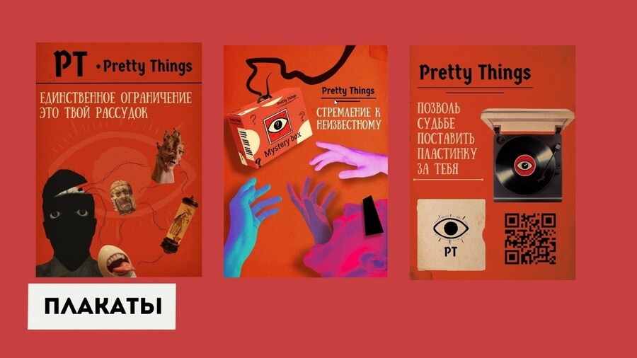 Промт: A concept image for the fictional antique brand Pretty Things. The image should have a minimalistic vintage-style eye logo in a black square on a red background. use a suitable color palette of shades of red, white and black. Also use a set of modern, clean fonts for brand text. Arrange all the elements in one image so that the logo is in the center, and the color schemes and fonts are neatly arranged around it. Use a minimalistic layout to draw attention to the mystery and mysticism and style of the brand