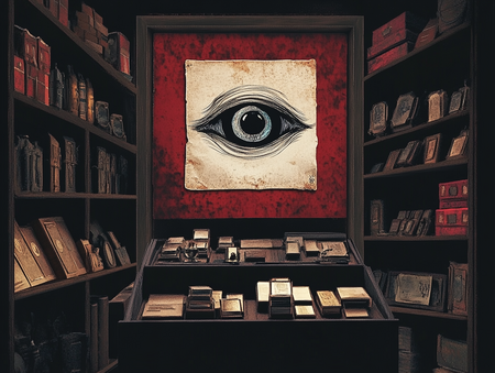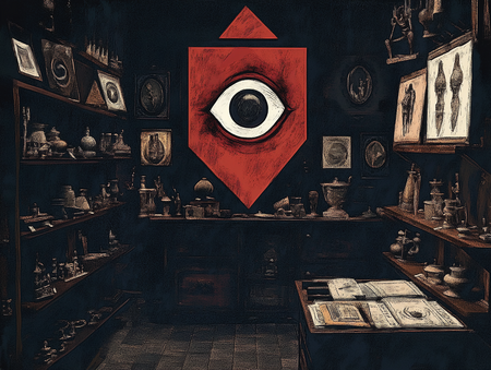 Промпт: Realistic detailed photo. An eerie, mysterious antique store selling mystical artifacts. The shop is meticulously organized, with neatly arranged items on shelves, all packed in mysterious, aged packaging. The atmosphere is one of quiet unease, evoking a sense of dread, but the space remains impeccably clean and well-arranged. The store features deep red, black, and white as dominant colors, with the red evoking a sense of danger, the black creating shadows and mystery, and the white adding an unsettling contrast. Dim lighting enhances the ominous atmosphere, with a faint glow from the shelves casting unsettling reflections