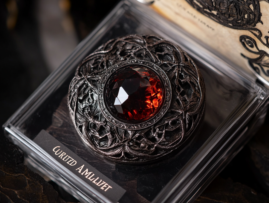 Промт: A close-up, highly realistic photograph of a mystical amulet displayed in the shop’s branded packaging. The amulet is circular, crafted from dark, aged metal with an eerie red gemstone in the center, resembling a glaring eye. It rests inside a clear, high-quality plastic box featuring the shop’s logo 'Pretty Things' in an elegant, gothic font, with a dark label that reads 'Cursed Amulet.' The label’s background has faint, intricate patterns that resemble ancient runes, reinforcing the mysterious brand identity