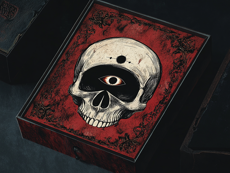 Промт: A sleek, mysterious packaging box for a mystical antique store. The box is designed to match the eerie atmosphere of the store, with deep red, black, and white as the primary colors. The logo on the front is a detailed, unsettling eye symbol, symbolizing both watchfulness and mystery. Above the logo, the words 'Pretty Things' are elegantly written in an unsettling, gothic font. The packaging has a smooth, glossy finish, with subtle, shadowy accents to enhance the sense of foreboding. The design is clean yet ominous, perfectly reflecting the eerie yet organized vibe of the store