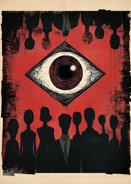 Промт: Design a vintage horror poster for an eerie antique shop. The central logo is a mysterious eye inside a bold, black square. Surrounding the logo are faceless figures dressed formally, with wide, piercing eyes staring forward. The color palette consists of deep reds, blacks, and whites to create a dark, sinister feel. The background texture is worn and faded, like an old, forgotten advertisement, adding a sense of horror and mystery to the poster