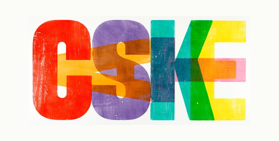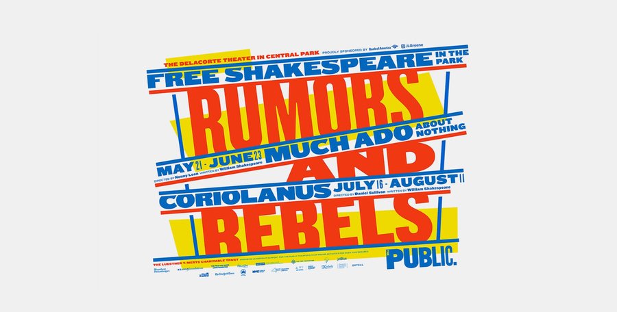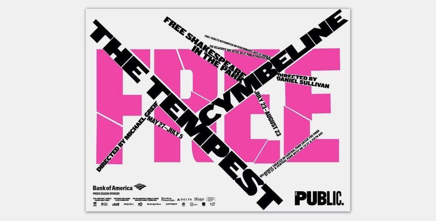 Работа с наложением цветных букв выполнена Кеном Барбером (Ken Barber) в технике леттерпресс. Постер «Shakespeare in the Park» создан студией Pentagram, автор — Паула Шер (Paula Scher).