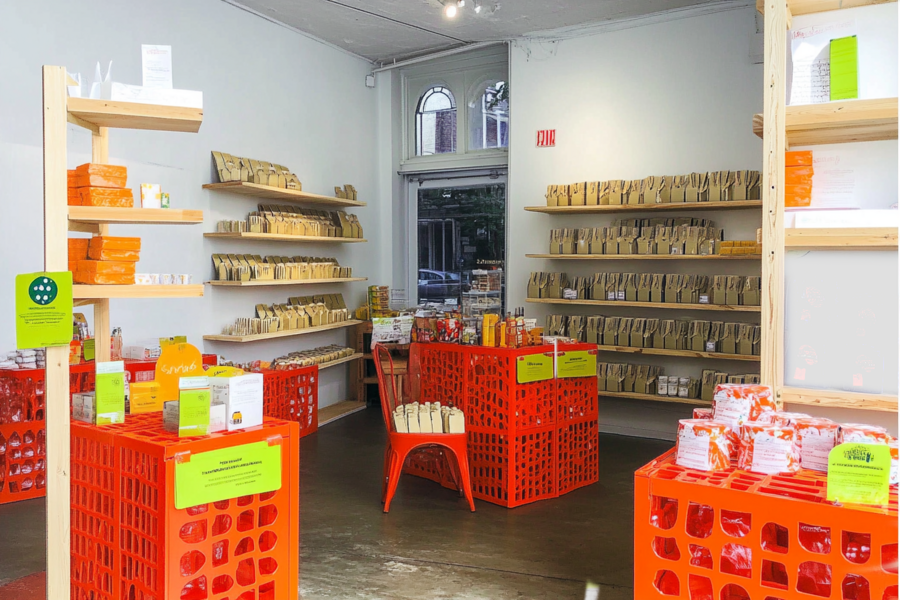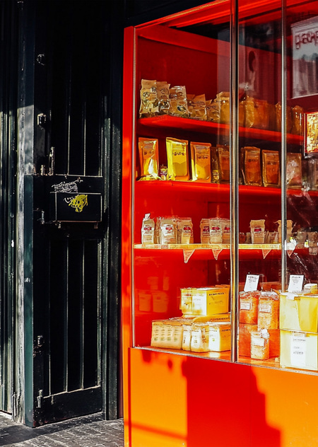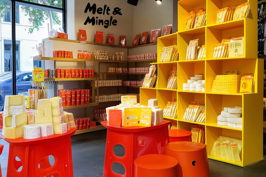 a shop outside in red and orange colors, glass, filed with bright packages of cheese and merch, --ar 3:2 --style raw --stylize 0