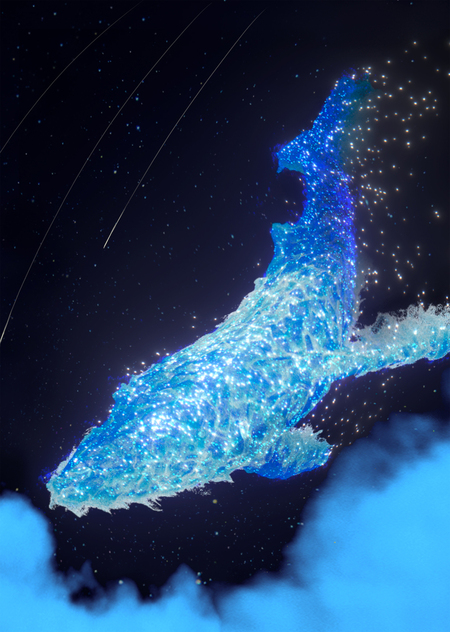 Он носит на себе вселенский груз, Искусство космоса, тайну светил и мгновений шум. Кит в небе — великий страж и хранитель, Мир вселенной нам в подарок приносит.