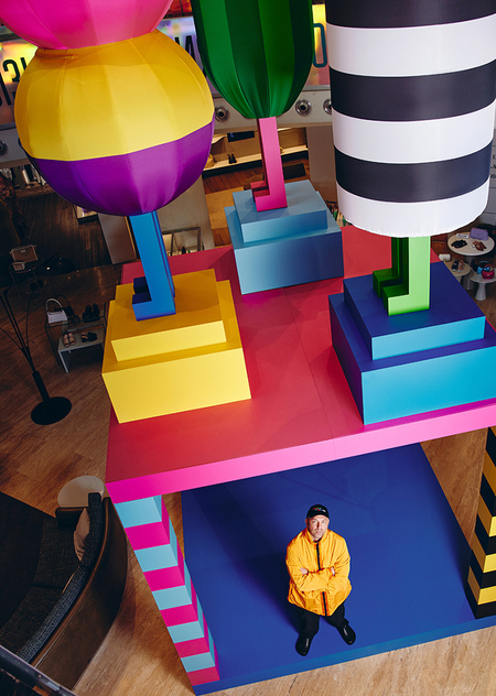 В экстерьере: оформление уличных фасадов экранами с анимацией и лайтбоксами. В рамках коллаборации, которая будет длиться в течении года, запланирована разработка капсульной коллекции одежды, уличных инсталляций, а также — проводятся культурные и образовательные мероприятия с участием автора.