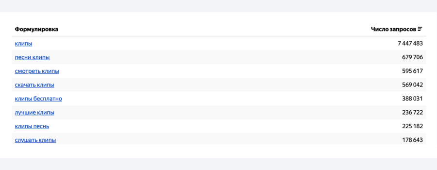 Поставив начальную цель для продвижения в виде Клипов и музыки, я не задерживаясь пошел в Яндекс Вордстарт и Google Trends для выявления популярных тем.