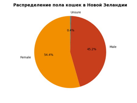 Из первого графика мы можем увидеть, что в Австралии количество самцов превышает количество самок на 5,5%. В Новой же Зеландии, ситуация иная: кошек больше, чем котов на 8,9%.