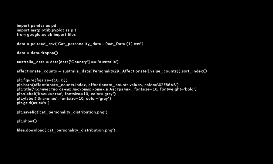 Как видно из диаграммы, количество ласковых Кошек в Австралии почти достигает 600. Хотелось бы искренне верить, что эти кошки ласковы не только потому, что это основная черта их характера, но еще и потому, что их хозяева любят и заботятся о них.