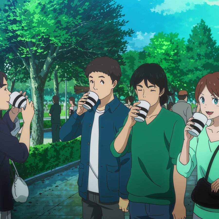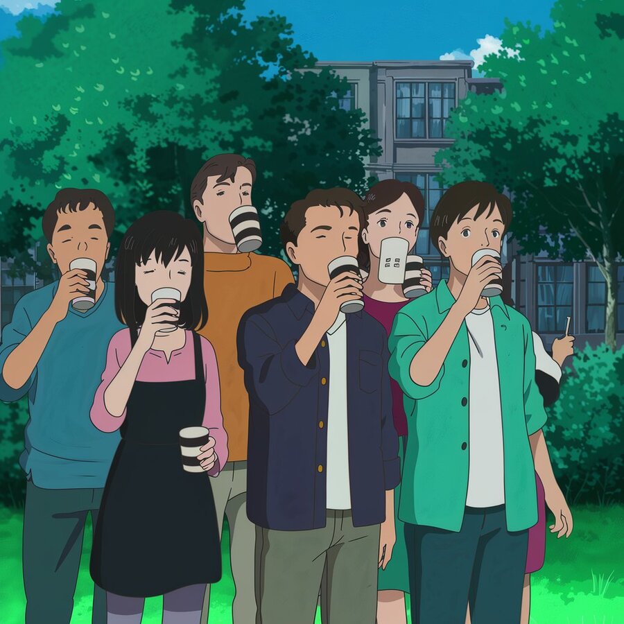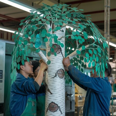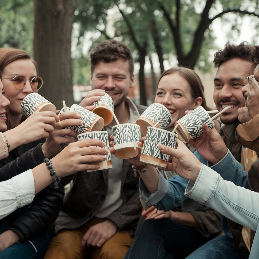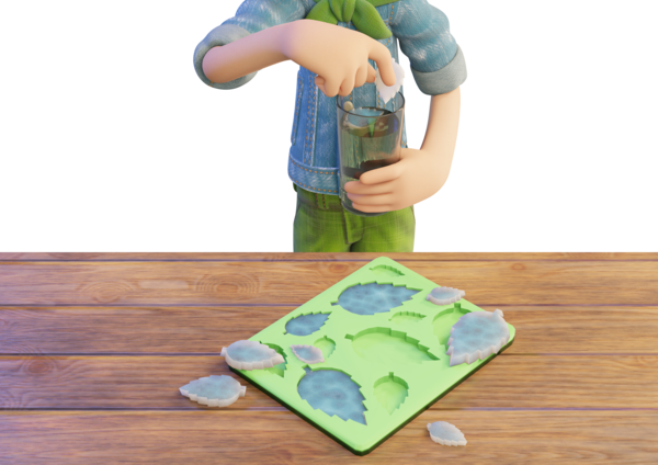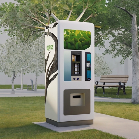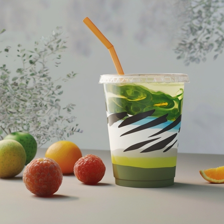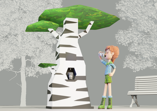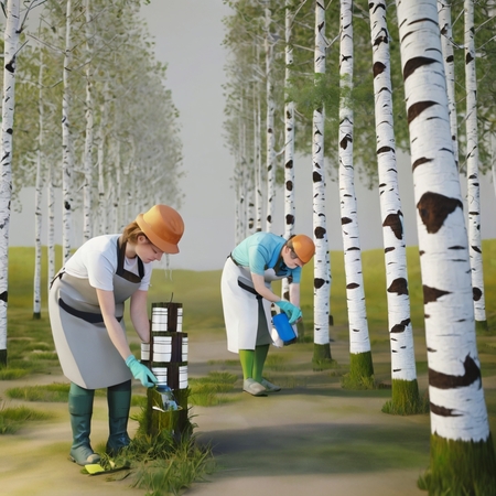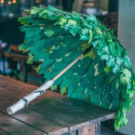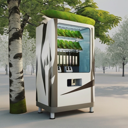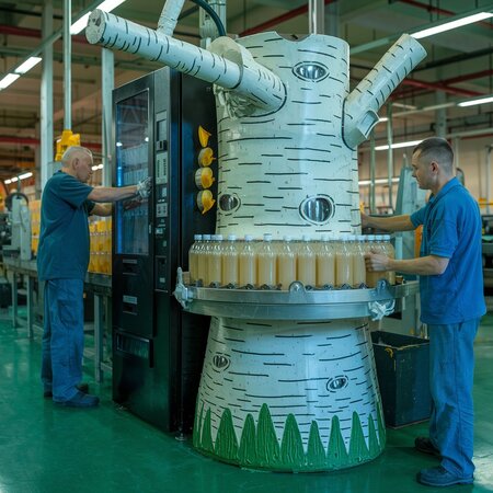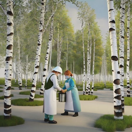 - A street vending machine for bottling natural birch juice stands in the park. It looks like a big white birch with black stripes. The leaves form a canopy from the rain and sun. There is a glass of juice in the hollow. - A paper cup. White with thin black horizontal lines. Inside the glass there is greenish birch juice and pieces of multicolored fruit ice are floating. - Square translucent pieces of ice with the addition of berry juice. raspberries, mint, honey. - A panama hat made of birch leaves lies on a wooden table. - The workers of the production shop walk between the rows of tall beautiful birches and carefully collect birch juice in glass bottles - Factory workers carefully tighten the lids of glass bottles with birch juice. - The umbrella is lying on a wooden table. The umbrella leg is made of a black and white striped birch branch, and the top is made of many green birch leaves, which resembles the crown of a tree. - An advertising poster of birch sap. The girl joyfully runs through the sports stadium, holding a glass of juice in her hand. An anthropomorphic log lies in the foreground and dries from the heat. The inscription «don’t dry up, driftwood