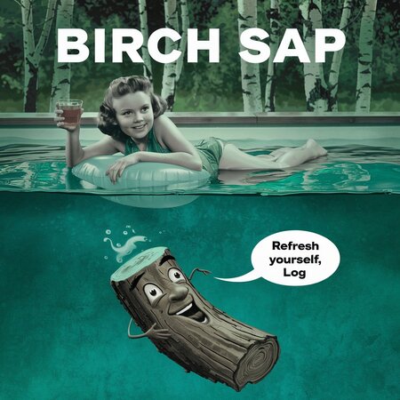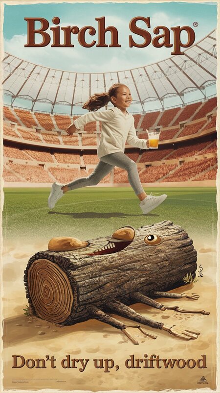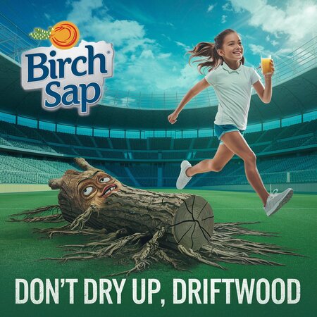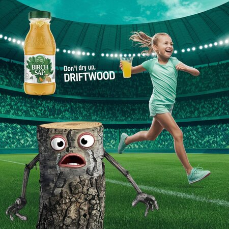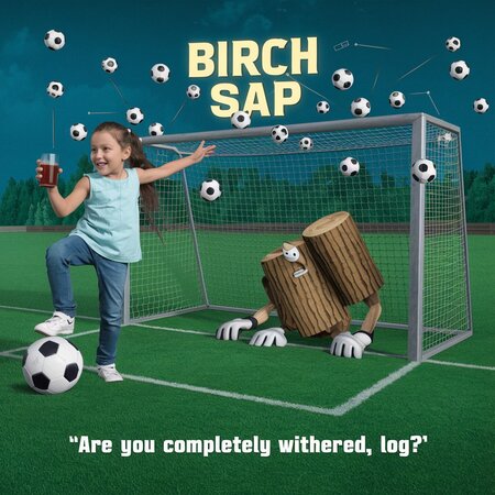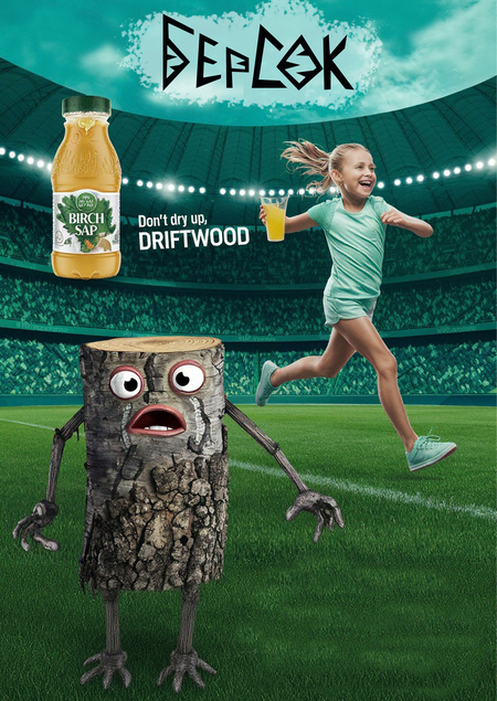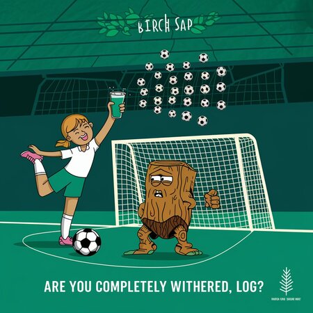 - An advertising poster of birch sap. The girl is joyfully standing at the football goal, one foot is on the soccer ball. The girl holds a glass of birch juice in her hand. There are a lot of goals scored and a tired and frustrated anthropomorphic log in the goal. The inscription: «is it completely withered, a log?» - The inscription BERSOK is made of birch trunks and lie on the green grass - Happy people drink birch juice from paper black and white glasses in the park