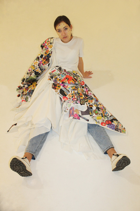 In addition, the space in the yard is covered with stickers: they are on pipes, on fans, on doors and walls. The stickers complement and reflect the peculiar «character» of the courtyard, through the stickers there is a «layering», «mixing» of groups. The stickers complement each other in this courtyard, resulting in a new, individual environment. It was the stickers that formed the basis of the product, both in shape and in idea.