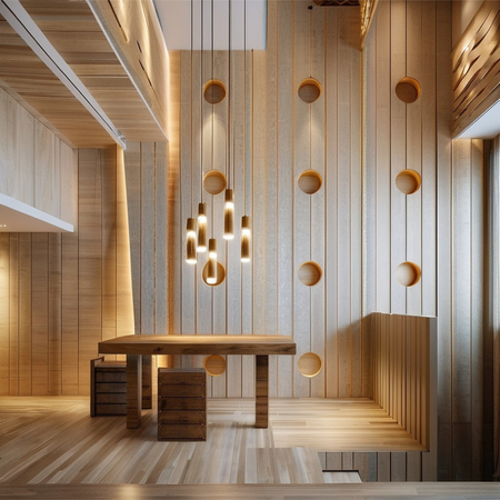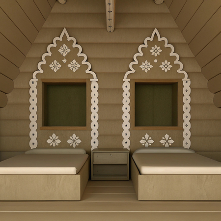 ПРОМТ: Russian-style interior design for a hotel in Kostroma using architectural Russian elements, such as a plowshare. The image shows a cozy Russian-style interior inspired by the traditions of wooden architecture. The walls are finished with a material imitating the texture of wood in a warm natural shade. Two square windows are decorated with carved white platbands with elegant ornaments in the form of flowers and geometric patterns, which emphasizes the national flavor.