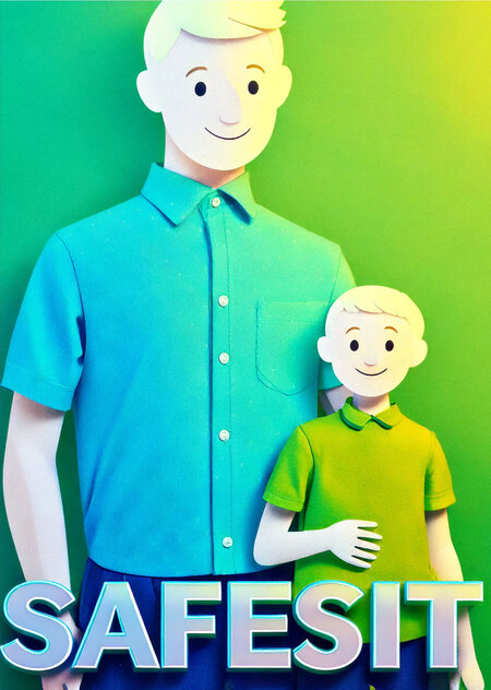Промт 2: Advertising poster for an organization recruiting children’s personnel with the «SAFESIT» logo. Minimalistic illustration of a dad and a boy in light clothes. Feeling of lightness and carefree. Minimum details.