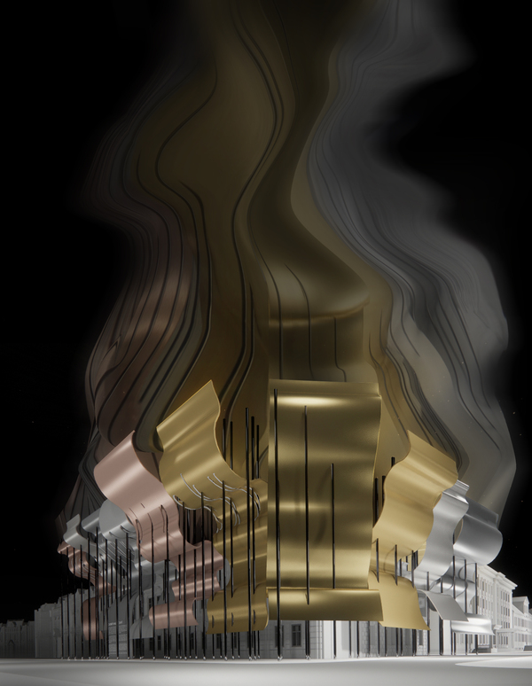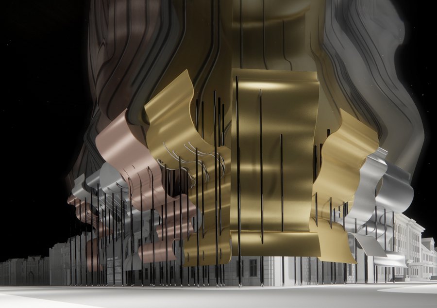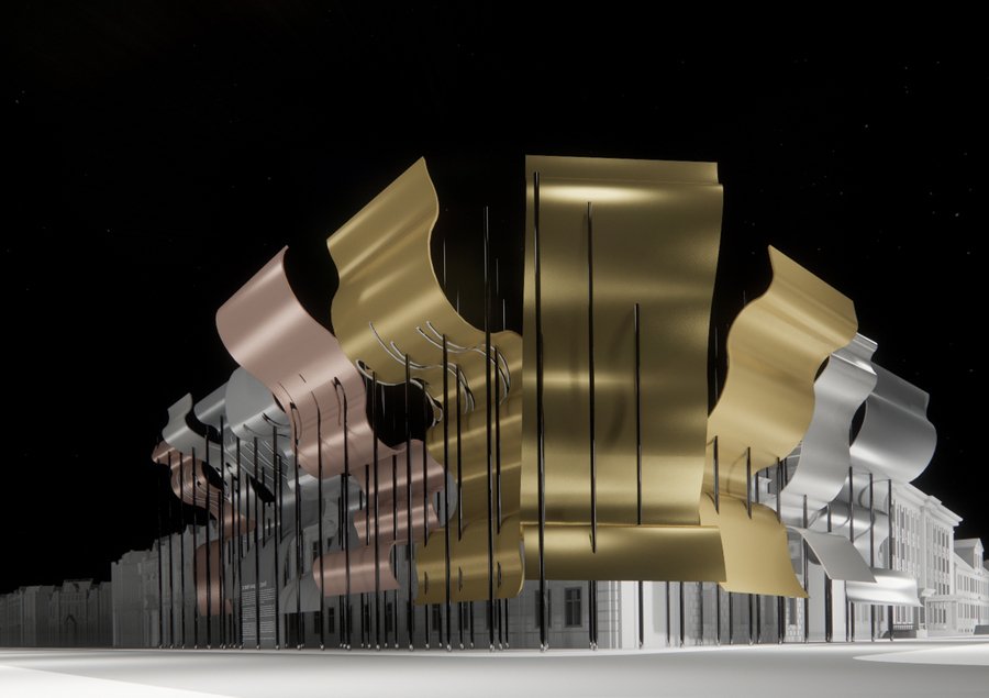 Превращаясь в световые объёмы, архитектурная композиция теряет свою материальность, отображая зыбкость и непостоянство мира.