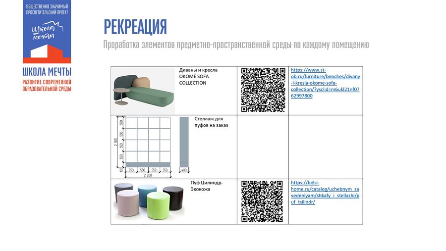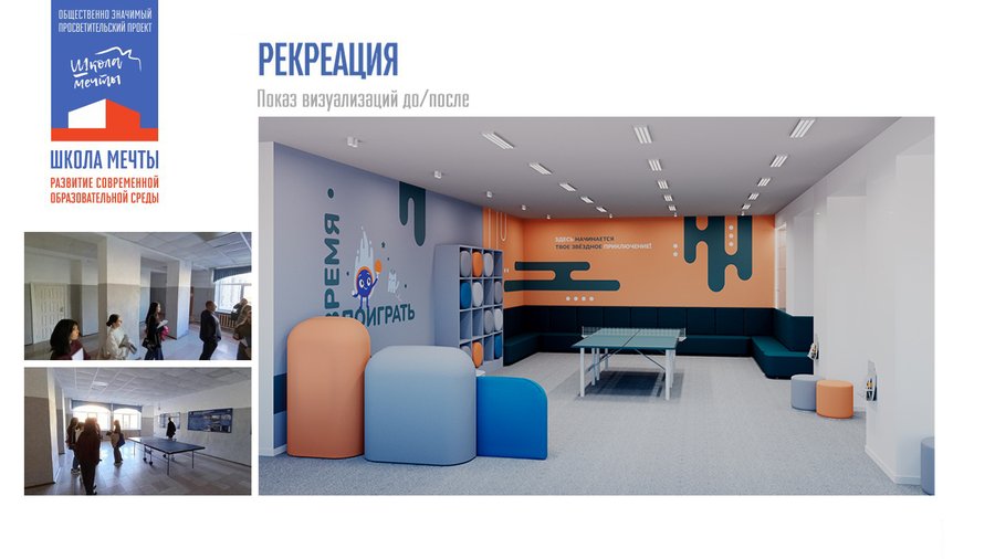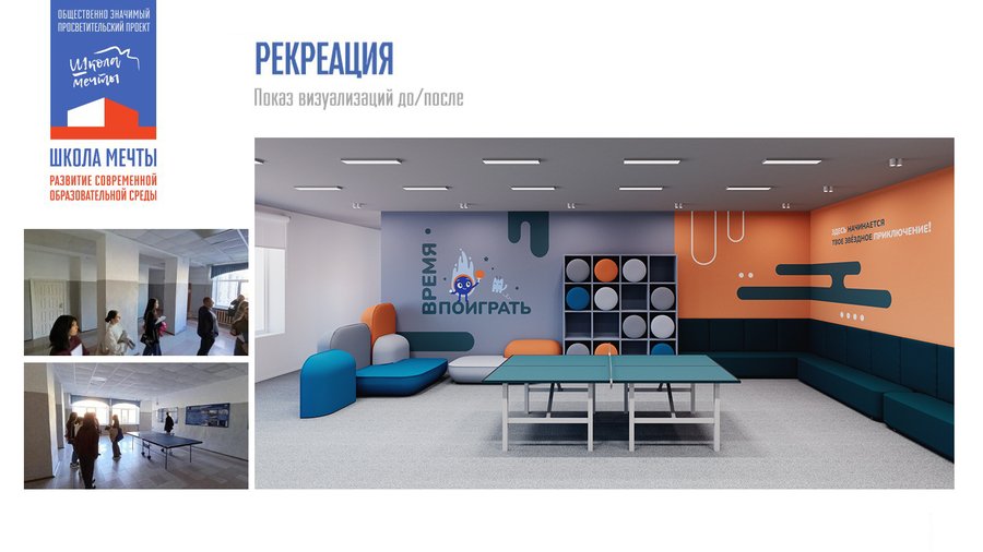 Рекреация является любимым местом школьников. Здесь изначально был установлен стол для пинг-понга, за которым учащиеся активно проводили своё свободное время. Однако остальная часть пространства не была должным образом организована, не было мест для сидения, чтобы наблюдать за игрой. Главной целью было сохранить игровую функцию этого пространства, сделав его более комфортным и функциональным, а также создать приятную атмосферу для игр и общения.