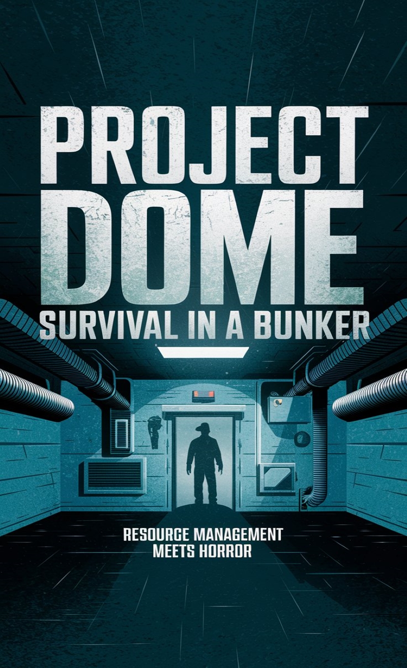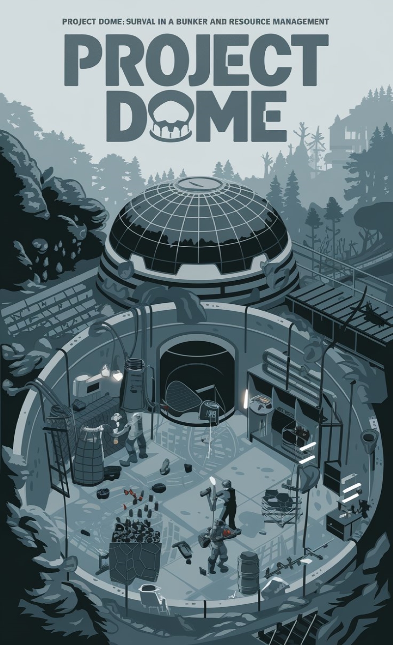4. Вид изнутри: Minimalistic illustration of the huge bunker from board game «Project Dome» from the inside in gray colors; 5. Процесс игры: A group of people is playing a board game about resource management and post-apocalypse called Project Dome; 6. Постеры: Posters for advertising a board game about survival in a bunker and resource management, called Project «Dome» in grey colors.