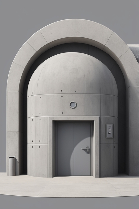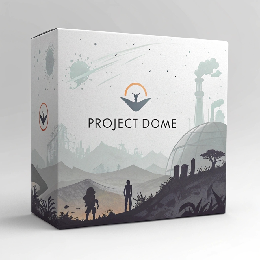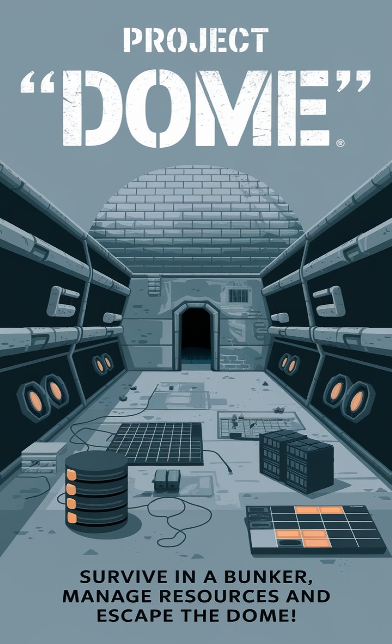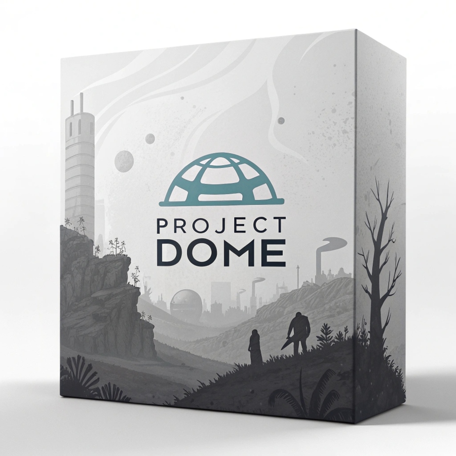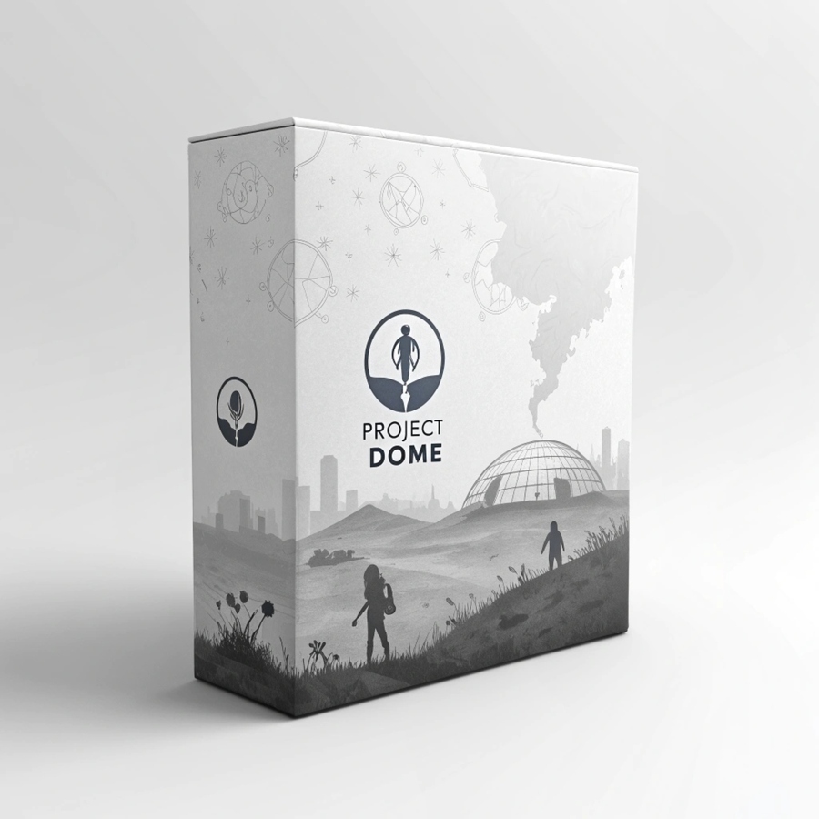 1. Обложка: Minimalistic poster showing the entrance to a bunker with a round roof and a closed door on a gray background; 2. Коробки: A minimalistic box for board games called Project Dome in minimalistic style with elements of Post-apocalypse in grey colors; 3. Поле (использовалась генерация на основе изображения): A serene and uncluttered representation of a board game’s playing field, depicted in a minimalist style, with grey colors, clean lines, simple shapes, with the game’s components, such as pieces, cards, or tokens.