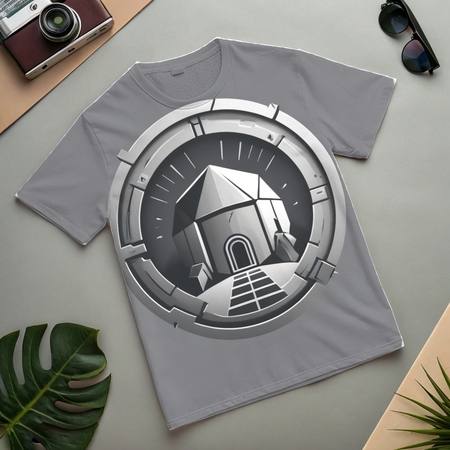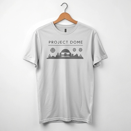 7. Логотип: Minimalistic logo for a board game about resource management and bunker survival called Project Dome in grey colors; 8. Мокапы футболок (на вторую футболку загружался ранее сгенерированный логотип, чтобы он использовался в генерации футболки): A T-shirt based on the board game «Project Dome» in a minimalistic style with elements of the post-apocalypse in gray colors