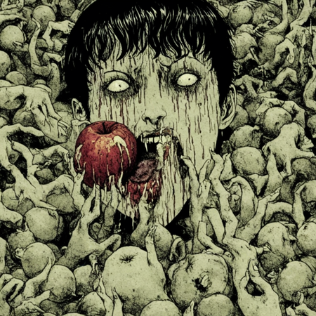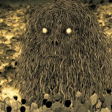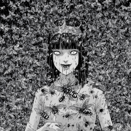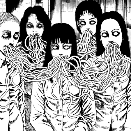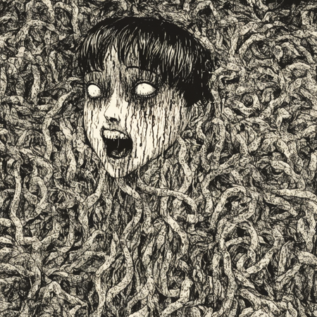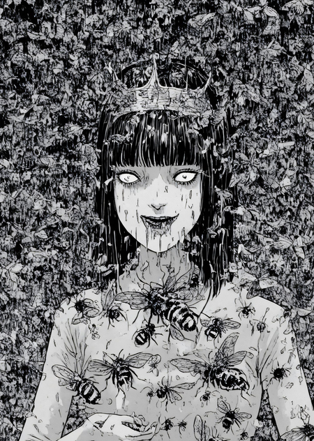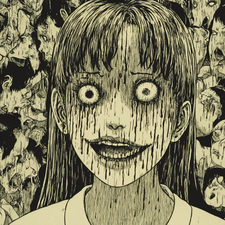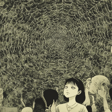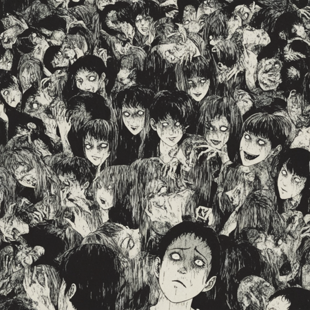 Так как итоговые сюжеты получились довольно абсурдными и сюрреалистичными, при изображении сюжетов я также ориентировалась на стиль Дзюндзи Ито. Это японский мастер хоррора, известный своими мангами в жанре психологического ужаса. Его творчество отличается атмосферой безысходности, абсурдными и пугающими образами, а также глубоким погружением в страхи и паранойю. Его стиль характеризуется сюрреалистичными, биоморфными монстрами (спирали, щупальца, сливающиеся тела), минималистичными фонами и акцентом на персонажах и их эмоциях.
