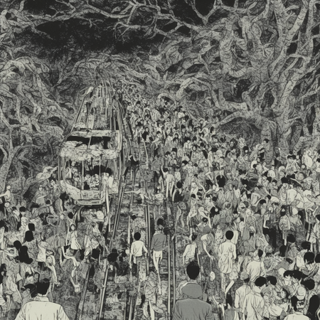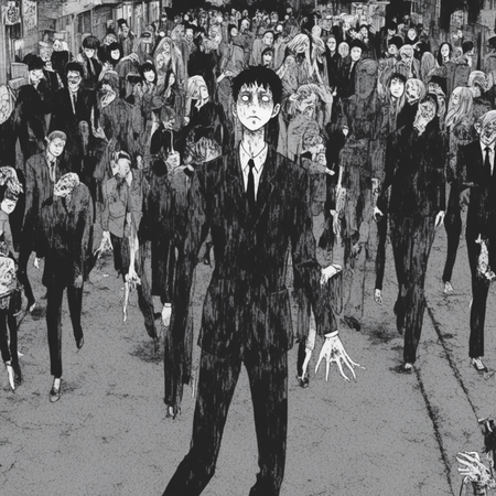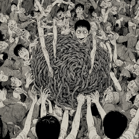 Итоговая серия визуализирует абсурдные и сюрреалистичные словосочетания через призму эстетики Дзюндзи Ито. • Абсурдность передана через гротескные трансформации тел (растянутые конечности, слияние людей в массы, неестественные позы). • Боди-хоррор проявляется в мотивах размытых лиц, органических деформаций. • Атмосфера безысходности читается в статичных, почти монотонных композициях, где персонажи будто застыли в вечном страхе.
