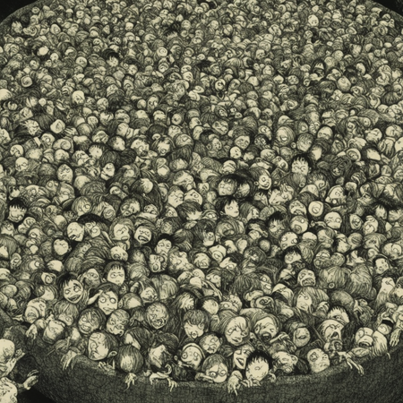 Нейросеть неплохо уловила ключевые черты стиля художника, но с некоторыми отклонениями: • Цветовая гамма: В отличие от чёрно-белой манги, некоторые изображений получились в желтоватых тонах, что придало им оттенок, близкий к винтажному ужасу. Это не противоречит эстетике Ито, но смягчает её графическую резкость. • Детализация: Лица часто стилизованы под манеру художника (пустые чрезмерно выразительные глаза, тонкие черты лица). Фоны соответствуют сюжетам, заметны также хаотичные текстуры, напоминающие штриховку. Артефакты генерации (лишние конечности, сливающиеся тела) тоже по-своему вписываются в концепцию, усиливая сюрреализм. • Повторяющиеся элементы: Нейросеть склонна дублировать мотивы (например, множественные руки в разных работах), но это усиливает ощущение масштабности.