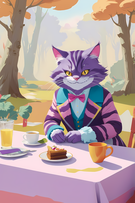 Промпт: A poster of Cheshire cat sitting on the table with white tablecloth in the woods. In front of him there is a yellow cup. On the table there is food.