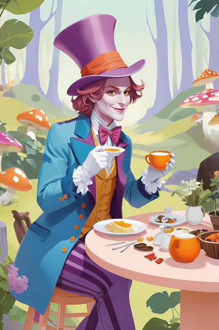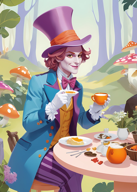 Промпт: A poster of Mad hatter sitting behind the table with white tablecloth in the woods. He is wearing purple suit, blue coat and purple hat. Around him there are a lot of plants, flowers and mushrooms. He is holding an orange cup. On the table there is food. His hair is red and his skin is white.