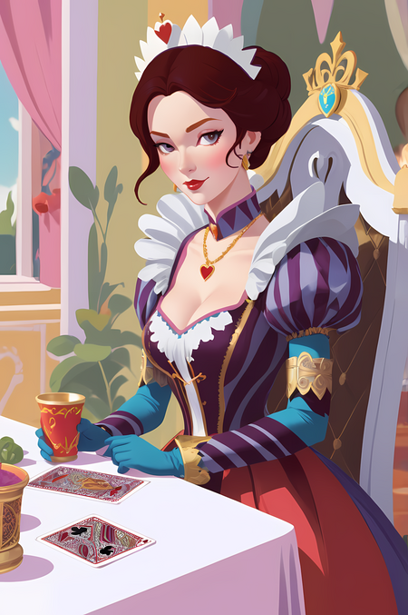 Промпт: А poster of queen of hearts sitting behind the table with white tablecloth in the throne room. she is wearing red and black dress with heart pattern. Around her there are a lot of playing cards. She is holding an orange cup. On the table there is food. Her hair is dark and in a bun.