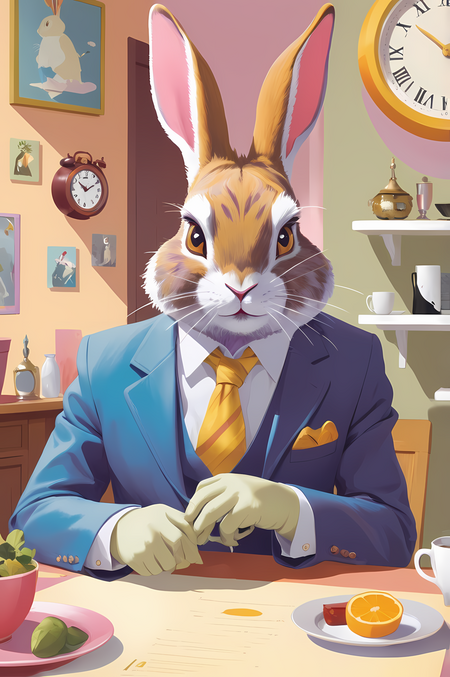Промпт: A poster of a rabbit in a suit sitting behind the table with white tablecloth in the rabbit hole. In front of him there is a cup. On the table there is food. there are a lot of clocks on the walls.