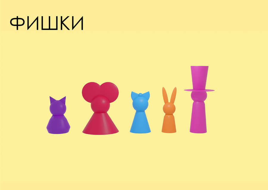 Промпт: Minimalistic figures for a board game: purple cat, red woman in a dress with a heart on her head, blue girl in a dress with a bow on her head, orange rabbit, tall pink man with a hat.