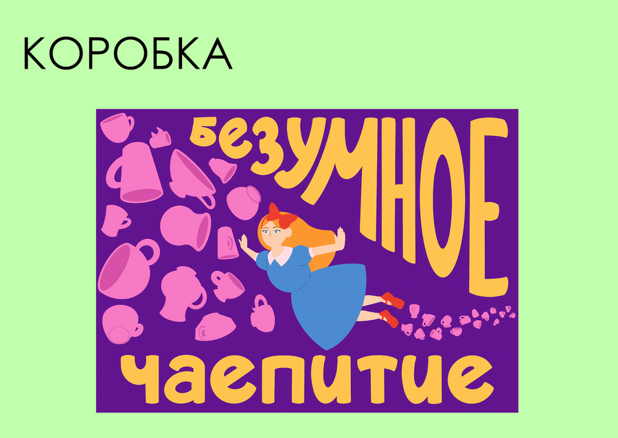 Промпт: A banner with an image of a purple box for a board game based on Alice in Wonderland. On the box there is an image of a girl with long blond hair with a lot of tea cups and cards around her. She wears a blue dress, a red bow and red shoes.