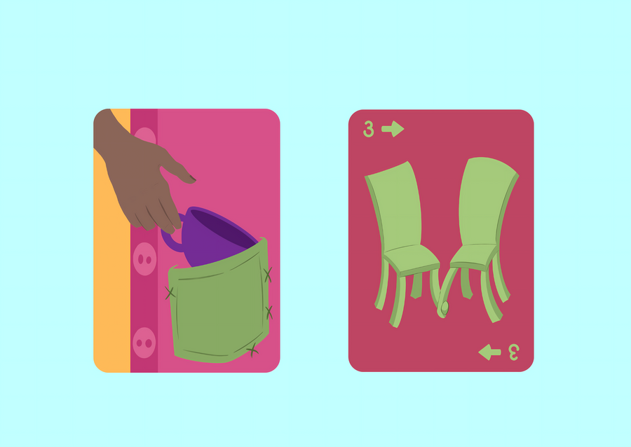 Промпт: A hand pulls out a purple cup from someone else’s green pocket on pink cloth. The image has a yellow background.