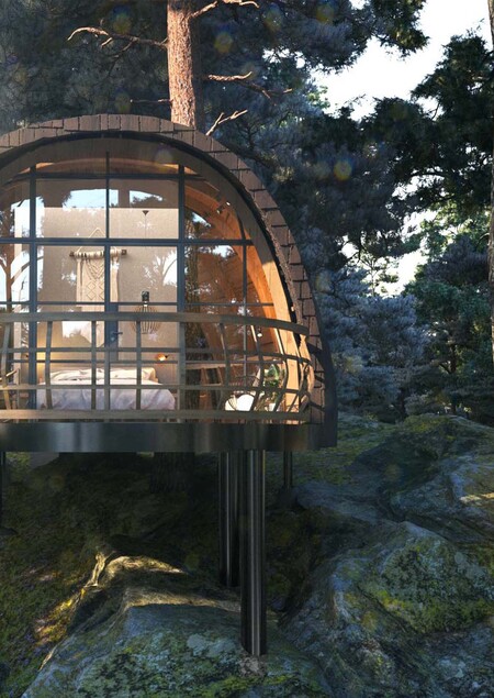Далее разрабатываются гостевые домики. Построены они по тому же принципу что и главное здание, только в меньшем масштабе. Из-за особенности рельефа, домики держатся на столбах, это позволяет вписать из в рельеф наших скал.