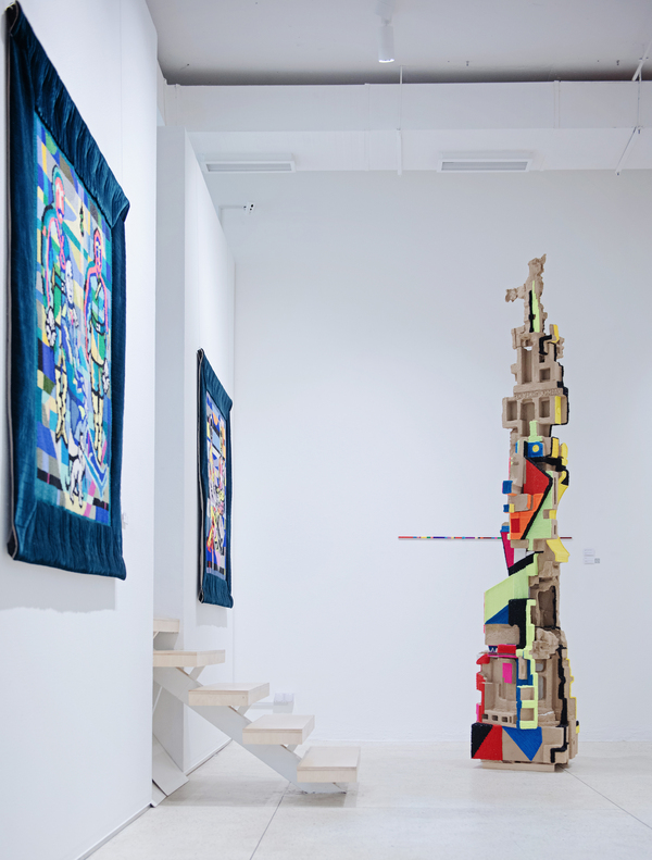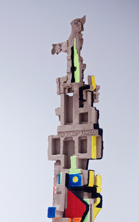 Главный объект на выставке скульптурная композиция в виде башни, собранной из имитированных глиняных блоков, хаотично нагромождённых друг на друга, то ли архитектурных руин с элементами резьбы по ганчу, то ли воссоздаваемой структуры с помощью яркой цветной облицовки. Инсталляция в концепции палимпсеста ассоциируется с силуэтами современных зданий, которые под бременем стремительно ускользающего времени возможно таким образом будут вписываться в будущий городской ландшафт. А возможно художник отсылает к сюжету Вавилонской башни по оставленным обращениям на узбекском, английском, арабском и итальянском языках, выложенным на участках стен, которые задаются вопросом «Сен узинг кимсан?» («Ты вообще кто такой?»). В этой канве возникает прообраз будущего, уходящего своими корнями в далекое прошлое и в нынешнем контексте реальности возникает интуитивное понимание прерывистости своего места в этом стремительно меняющемся мире.
