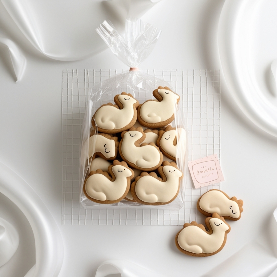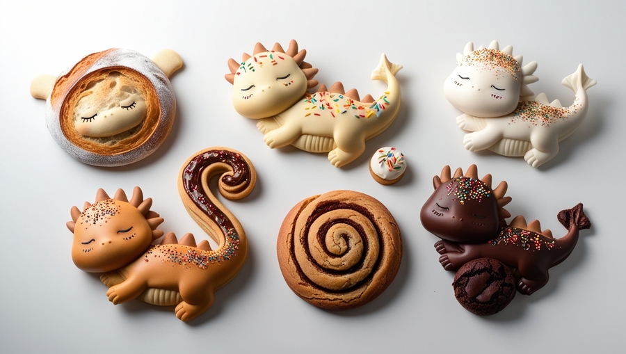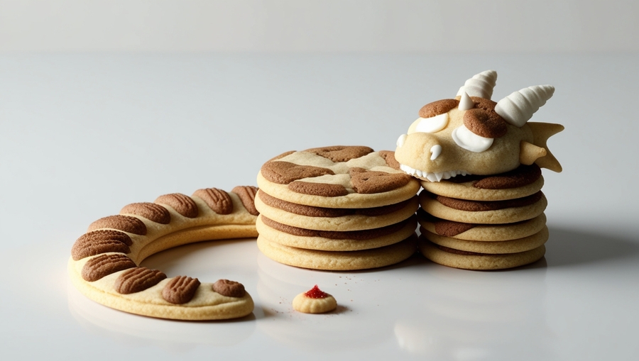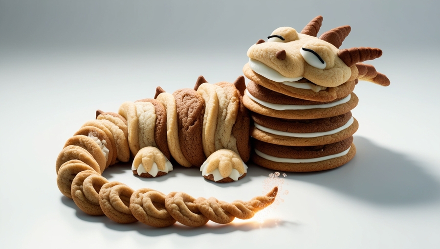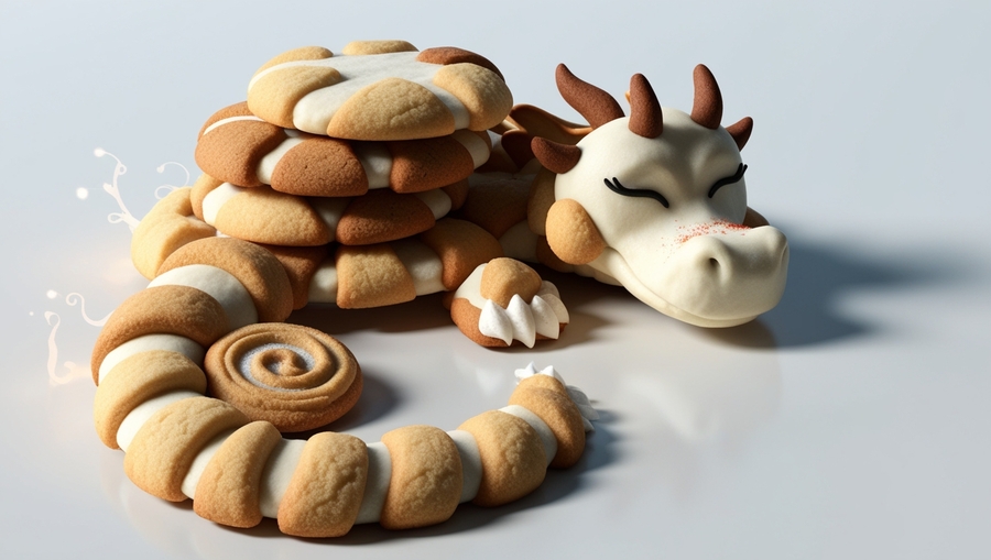 Промт печенья: a whimsical, low-poly, sleeping dragon crafted from a stack of cookies, with gentle, rounded edges and soft, puffy texture, resting on a pristine white background, its cookie scales in varying shades of golden brown, with a smidge of creamy white frosting for eyes, a tiny sprinkle of red sugar for the nose, and a delicate, swirly cookie-patterned tail coiled around its body, emitting a subtle glow, as if fresh from the oven.