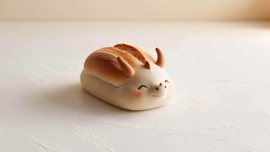 Промт хлеба: a whimsical, soft-focus illustration of a small, adorable dragon-shaped bread loaf, rendered in gentle, rounded lines and minimal textures, reclining peacefully on a pristine, creamy white background, with a subtle, warm glow and delicate, feathery scales on the bread crust, and a sweet, serene expression on its bread-dough face, featuring a tiny, button nose and a few wispy, golden-brown eyebrows, with a hint of warmth and coziness evoking a sense of comfort and tranquility.