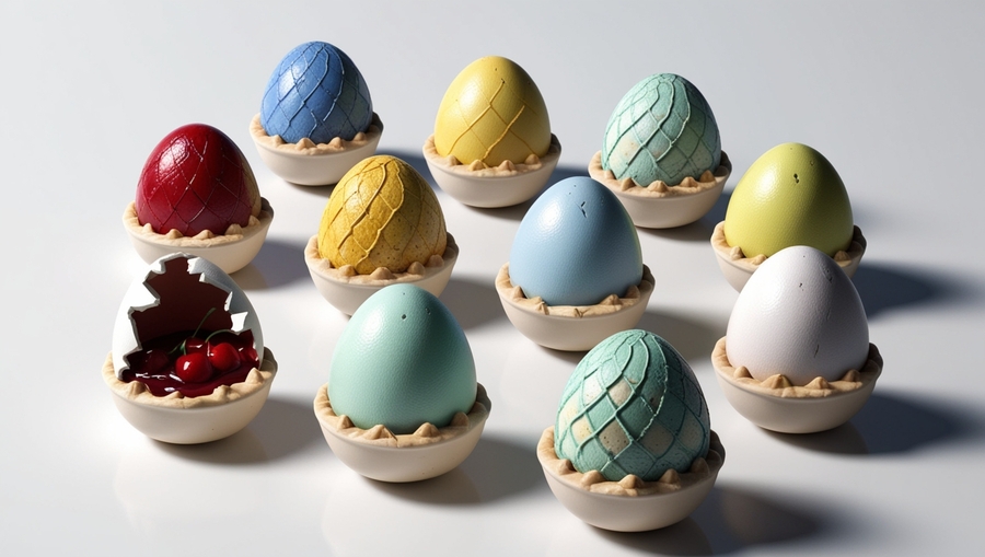 Промт яиц: a whimsical illustration of six to eight low-detailed, adorable dragon eggs, each with a different pie filling visible through a cracked or broken shell, resting on a pristine white background, with the eggs varying in size and orientation, and the pie fillings showcasing a vibrant color palette, such as cherry red, lemon yellow, sky blue, and mint green, with textures and patterns reminiscent of classic pastry, like crisscrossed crusts and delicate swirls, evoking a sense of wonder and curiosity.