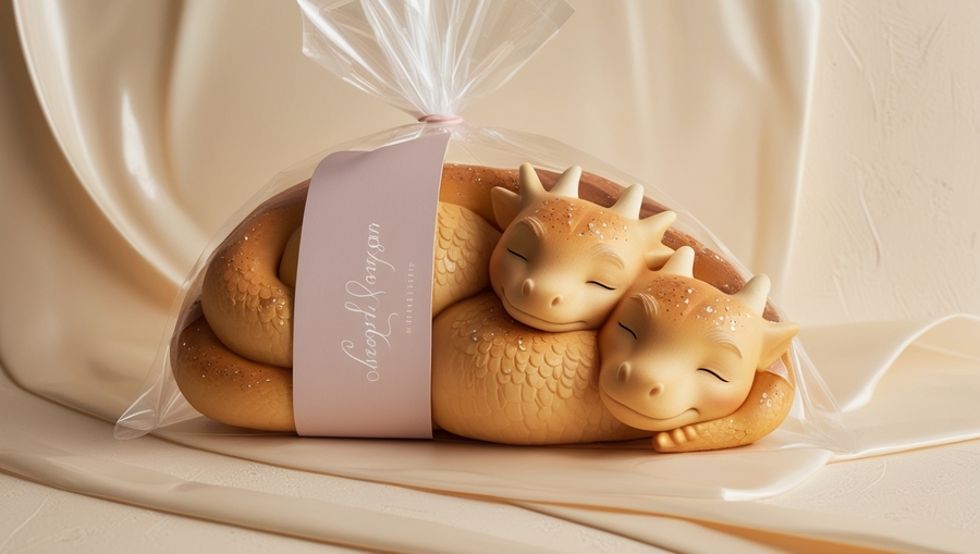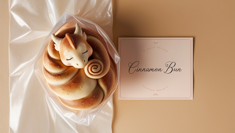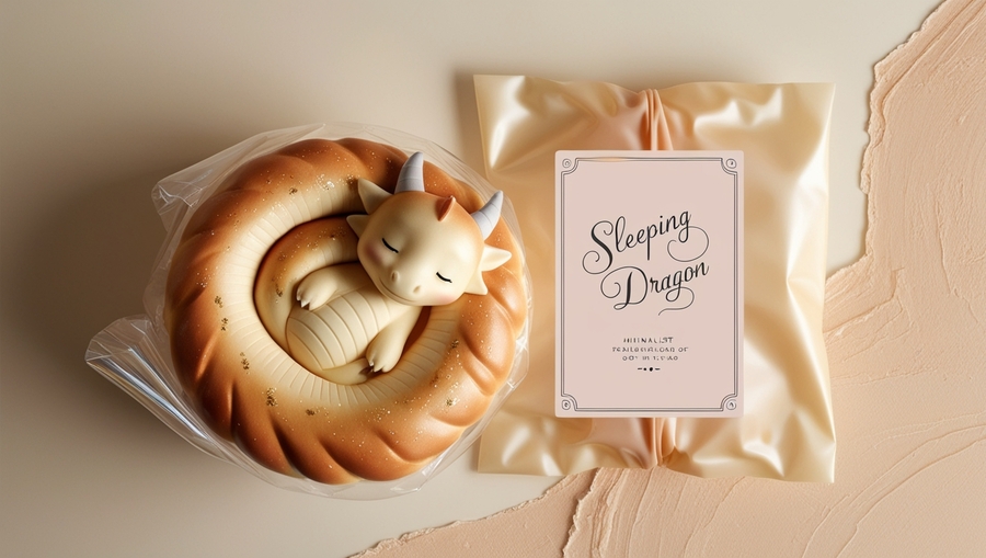 Промт упаковок: a whimsical, soft-focused, and endearing sleeping dragon, its body curled up into a cinnamon bun shape, complete with swirly curves and a sweet, gentle face, nestled in a transparent plastic or cellophane package, with a subtle sheen and soft creases, adorned with a minimalist, pastel-colored label featuring elegant, cursive script, against a warm, creamy background that complements the dragon’s golden brown scales, which are adorned with subtle, shimmering highlights, with a muted, earthy color palette and subtle texture to evoke a sense of warmth and coziness.
