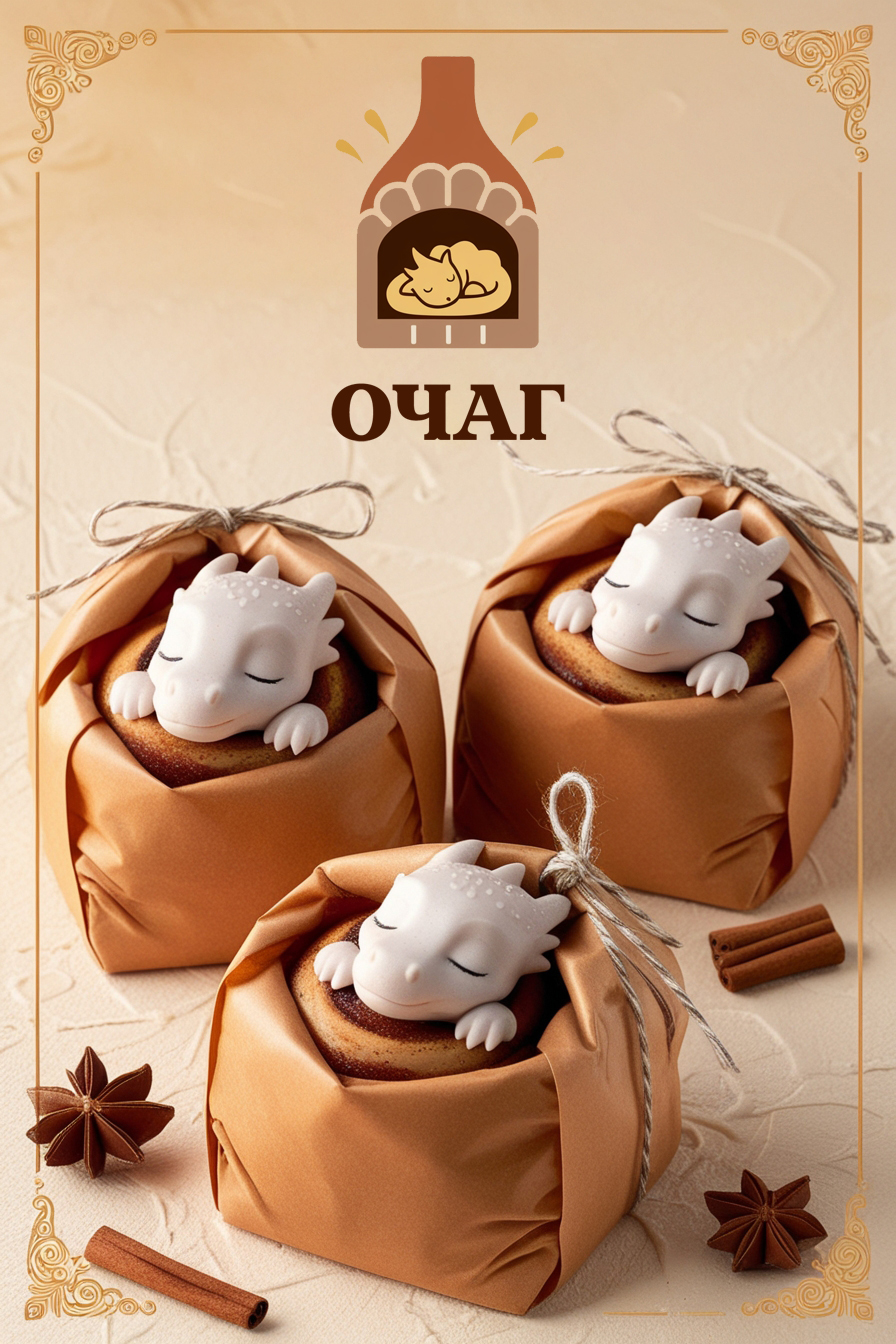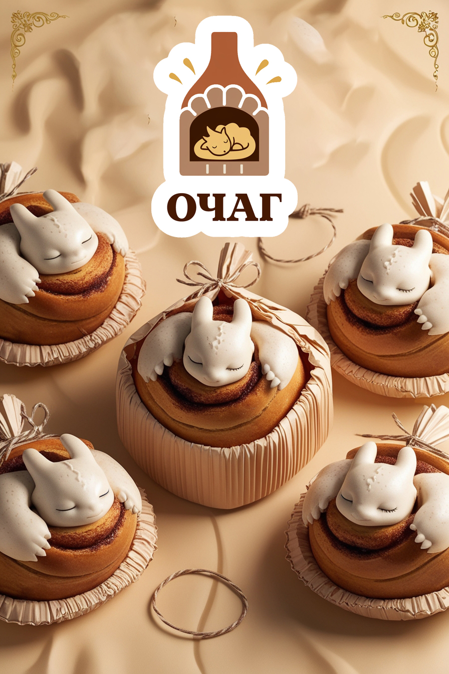 Промт плакатов: Vibrant promotional bakery posters featuring the logo «Очаг» prominently displayed in bold, golden font with ornate details, surrounded by tender, low-detailed illustrations of adorable sleeping dragons cleverly shaped like cinnamon buns, each snuggled within a crinkled, golden-brown paper package with a delicate twine tie, set against a warm, creamy background that evokes the inviting aroma of freshly baked goods, with the overall design exuding a sense of cozy comfort and mouthwatering delight.