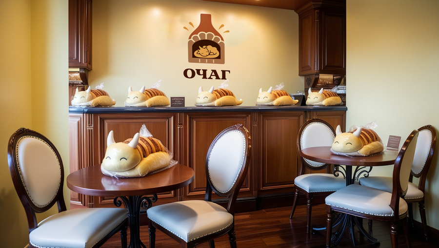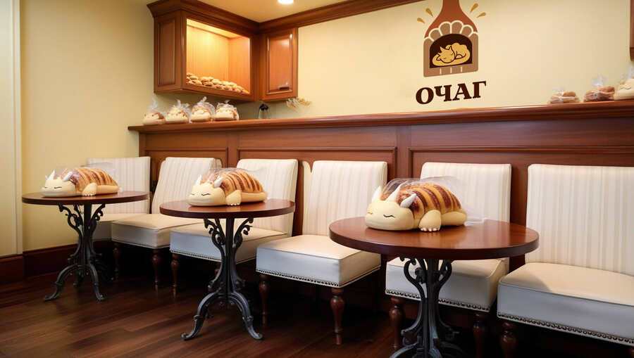 Промт интерьера: A warm and inviting interior of a point of sale for bakery products featuring the logo «Очаг» in a modern, cursive font with golden accents, displayed prominently above the counter. Adorable sleeping dragons, each shaped like a cinnamon bun and wrapped in transparent packaging, are placed on wooden tables with ornate metal legs, surrounded by comfortable, cushioned chairs with white upholstery and dark wood frames. The walls are painted a soothing creamy yellow, complementing the warm tones of the wooden accents and the golden logo. The floor is made of polished, dark hardwood, and the overall atmosphere is cozy and welcoming, perfect for customers to relax and indulge in the freshly baked treats on display.